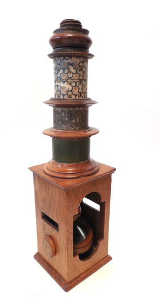 illuminated by natural light passing through the white alabaster the four views of the SPA Town Matlock, Derbyshire, observed by rotating the handle are: The Promenade, High Tor, the Ferry, Matlock Bath. The viewer measures 4.5 inches in height.