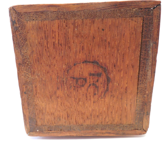 Im Kasten ist das Handelszeichen ( Logo, Trade Label) von Culpeper eingeklebt. Dieses ist sehr gut erhalten und zeigt ausser dem Namen von Culpeper verschiedene wissenschaftliche Instrumente wie Globus, Jacobsstab,Screw barrel microscope, Plantisch, Nocturnal,etc. und den berühmten gekreuzten Dolchen. " Crossed Daggers)