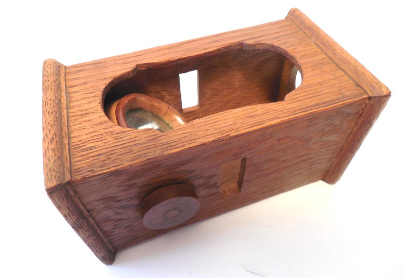 Einzigartiges Screw Barrel Type Mikroskop ( Boxmikroskop) auf einem Wurzelholz Kasten montierbar.