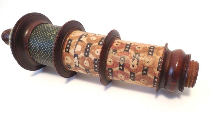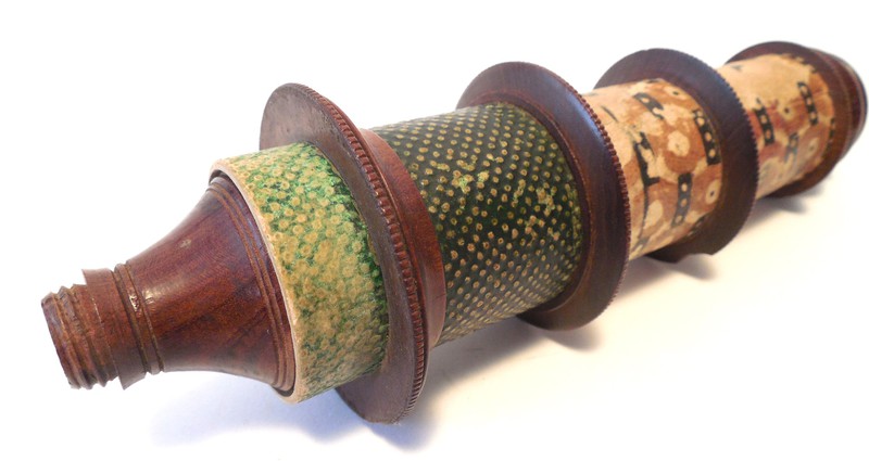 Der äussere Tubus ist aus Pappe gefertigt und mit sehr schöner, rot-weisslicher Rochenhaut überzogen. Der Schiebetubus hat einen grünlichen Lederüberzug und ist mit goldgeprägten Punkten markiert, die die Positionen für die Fokussierung anzeigen.